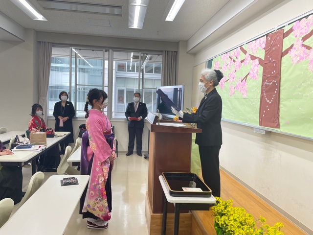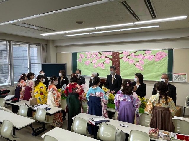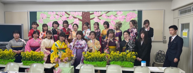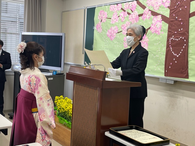 公開日 2021年03月16日 壁面の飾りと花は岩﨑先生が用意してくださいました。保育科らしい素敵な演出です。 石井学科長から、一人ずつ卒業証書を渡していただきました。 毎年、全国保育士養成協議会から各校の成績優秀者1名が表彰されます。今年は岸若菜さんでした。おめでとうございます。 石井学科長のお祝いの言葉を受けて、学生代表として佐々木浩美さんがお礼の言葉を述べてくださいました。 教員一人一人に花束をいただきました。温かいお気持ちに感激しました。 最後は記念撮影。皆さん、新しい場所で美しい花を咲かせてください。また会えることを楽しみにしています。
