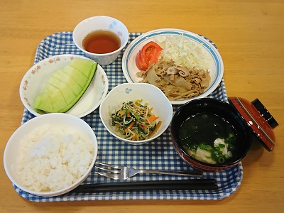 本日の献立:豚肉の生姜焼き、ほうれん草ともやしの和え物、みそ汁、メロンです。