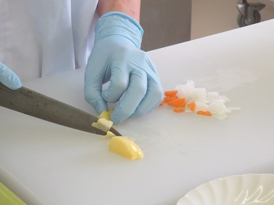 さあいよいよ調理開始です。パッククッキングで炊き込みご飯を作ります。材料は火の通りをよくするため薄く切りましょう。