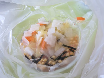 ポリ袋に、米・水・材料を入れて、味付けはさけ茶漬けの素を使用します。