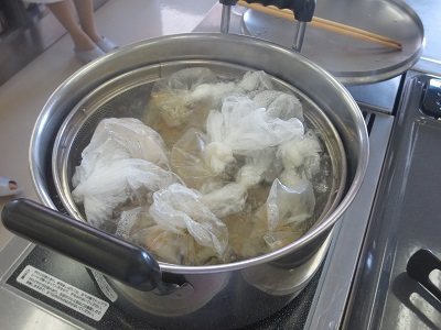 空気を抜いて結び、鍋で30分煮ると出来上がりです(ザルに入れて煮るとポリ袋が破れるのを防ぎます)。