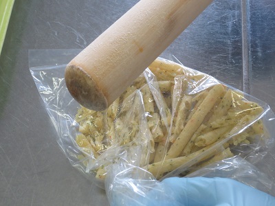 続いてじゃがりこでポテトサラダを作ります。じゃがりこは袋に入れて砕いて、湯を加えてもみます。