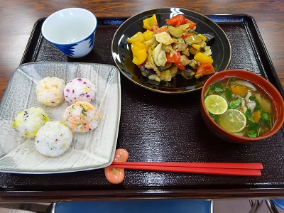 本日は「夏野菜と地産豚のオイマヨ炒め」「手まり握り」「そば米汁」「わらび饅頭」を作りました。