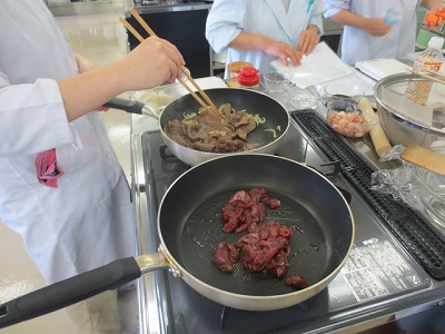 栄養学各論実習の授業で、シカ肉レシピ集に掲載するためのシカ肉メニューの試作を行いました。