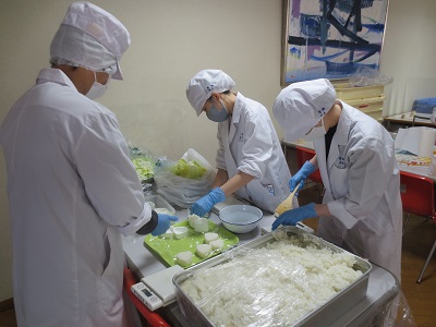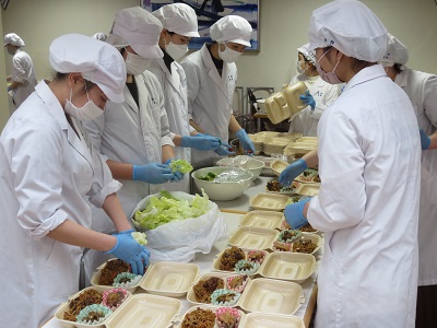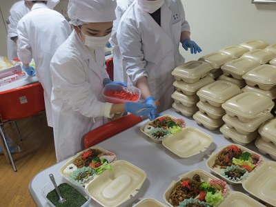 調理は学生食堂「パウゼ」に依頼し、盛り付けを学生全員で担当します。
