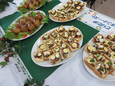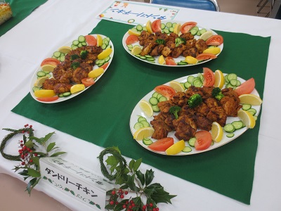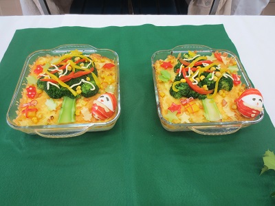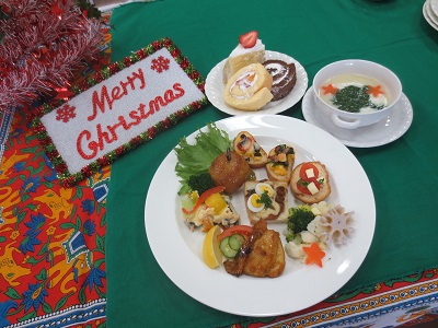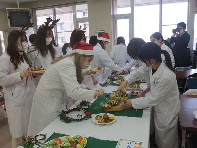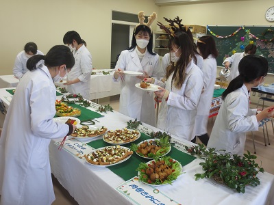 2年生後期開講の栄養学各論実習では、行事食としてクリスマスバイキングを実施します。