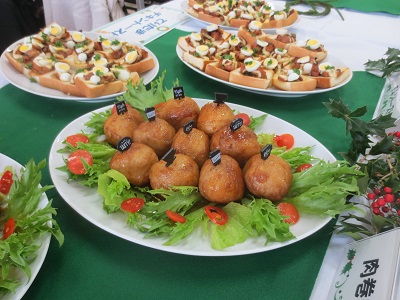 本日のメニュー (主食)2種類のタルティーヌ ブル酢ケッタ てりたまチキントースト 肉巻きおにぎり