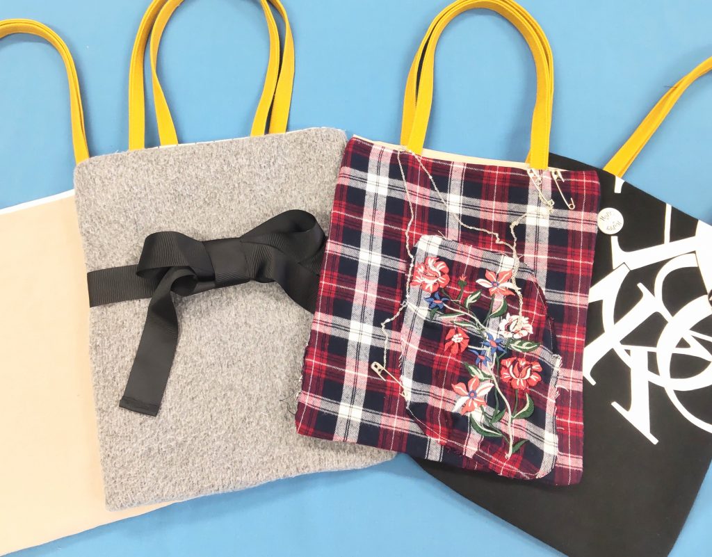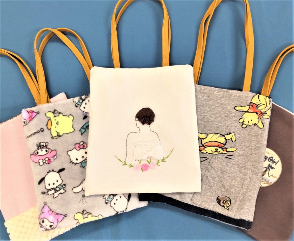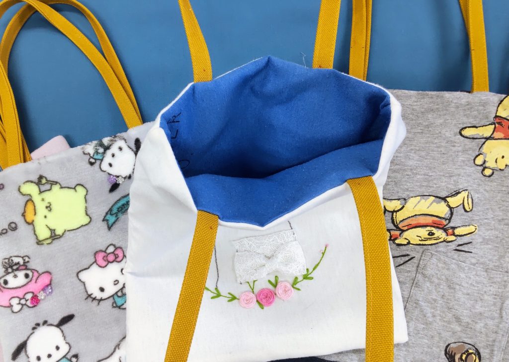 裏地に拘ったり、服に付いていたボダンや刺繍を上手に利用したり、素敵な手提げのカバンがになりました。
