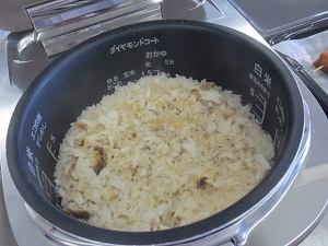 鯛を焼き、身をほぐして米と調味料と一緒に炊飯します。