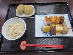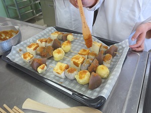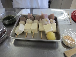 じゃがいも、そばだんご(アレルギー対応のため今回はなし)、岩豆腐、丸こんにゃくを串に刺し、甘辛いみそだれをつけて焼きます。