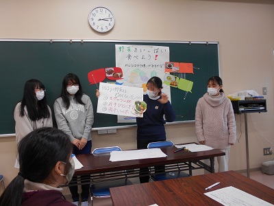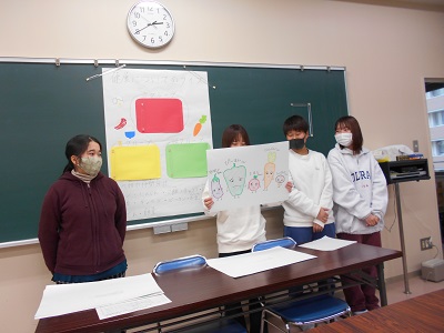 公開日 2022年02月22日 1年生後期の栄養指導実習Ⅰで実際に栄養教育を行いました。 わかりやすい教材を作成しています。 「野菜をいっぱい食べよう」と題して説明しています。 子ども向けにクイズを行っています。 班のみんなで協力をして行いました。
