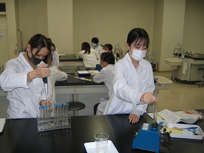 1年生後期の「食品学各論実験」では、食品を様々な方法で分析します。 本日の実験内容は、食品中のたんぱく質量の測定です。
