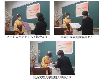 【成績優秀者表彰】 ✿ フードスペシャリスト協会より 特別表彰(左上) ✿ 栄養士養成施設協会より 栄養士実力認定試験成績優秀者表彰(右上) ✿ 徳島文理大学より 成績優秀者表彰(下中央)
