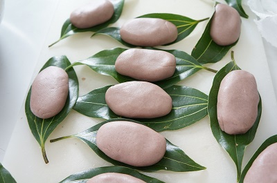 生地にあんこを練りこんだ「練りこみ」は他県にはない徳島の特徴です(写真はニッキの葉)。