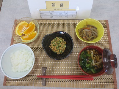 朝食は、ごはん・納豆和え・きんぴらごぼう・みそ汁・オレンジです。