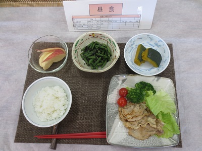 昼食は、ごはん・豚の生姜焼き・さやいんげんごま和え・かぼちゃ含め煮・りんごです。