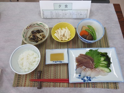 夕食は、ごはん・刺身・煮物・エリンギソテー・山芋二杯酢です。