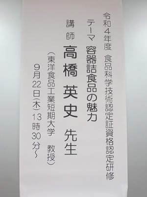 令和4年9月22日(木)、認定研修会がオンラインで開催されました。 研修会タイトル:「容器詰食品の魅力」 講師:東洋食品工業短期大学 教授 高橋英史先生