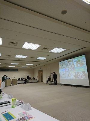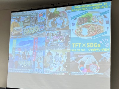 食物専攻からは、2016年から取り組んできた、ジビエ(シカ肉)の有効利用の活動と、本学のTABLE FOR TWO TFT(TFT)とコラボレーションしたランチボックス提供の実践的な取り組みを紹介しました。※TABLE FOR TWOとは、開発途上国の飢餓と先進国の肥満や生活習慣病の解消に同時に取り組む、日本発の社会貢献運動です。