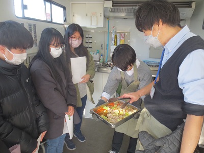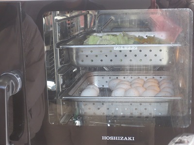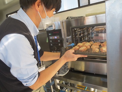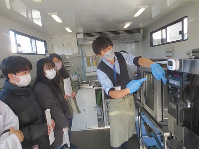 次に、班ごとに交代で屋外に移動し、電化厨房機器が実際に使用されているところを見学しました。
