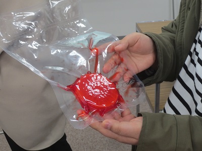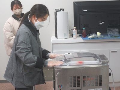 でんのすけ号見学以外に、機器の説明を受けたり、真空包装機による調味液の浸透状態を体験しました。