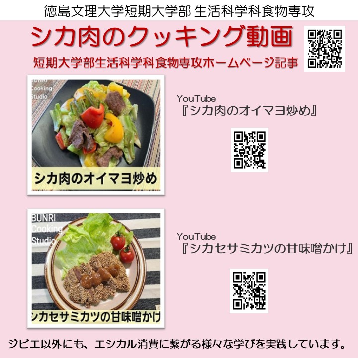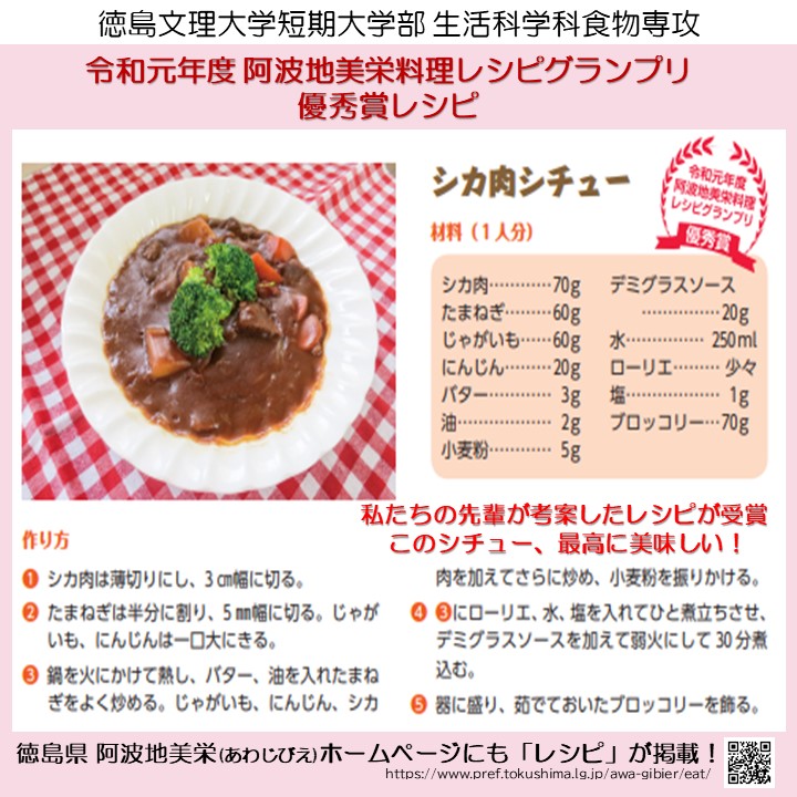 公開日 2023年04月01日 シカ肉シチューは、阿波地美栄「レシピ」にも掲載 https://www.pref.tokushima.lg.jp/awa-gibier/recipe/ シカ肉レシピ動画はこちらから https://wwwt.bunri-u.ac.jp/tandai/19095 阿波地美栄「食べる」 https://www.pref.tokushima.lg.jp/awa-gibier/eat/ ↓ Instagramはこちらから ↓ https://www.instagram.com/tbu.jc.fs_official/