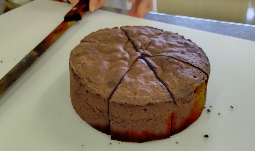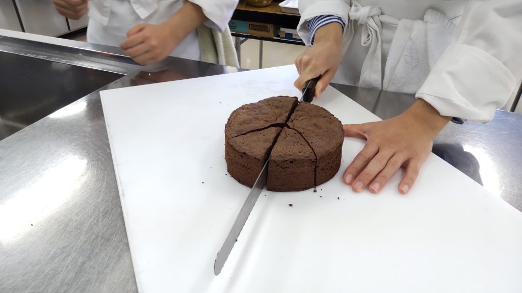 公開日 2023年04月25日 1年生の洋菓子実習授業でガトーショコラをつくりました。 濃厚チョコの美味しそうな香りが自習室いっぱいに広がります。 やっと、焼き上がりました! 等分にカットするのもなかなか難しいものですね!