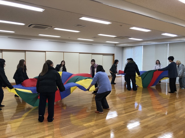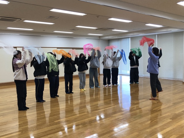 後半は、リズム室に移動して音楽療法の体験をさせていただきました。 最初はスカーフを使って音楽に合わせてヒラヒラさせたりポーンと上に放り上げてキャッチしたり、とても楽しかったです。