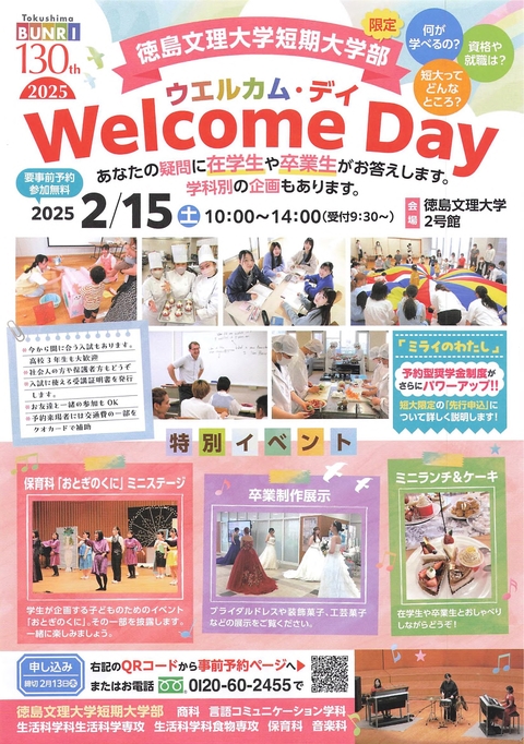 徳島文理大学短期大学部では、「Welcom Day」を2月15日(土)に開催します。