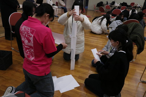 新入生、学生スタッフが参加してコミュニケーションゲーム「バースデイライン」と「ペーパータワー」を行いました。
