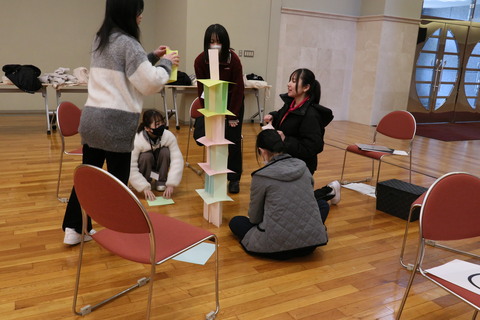 先ず、短期大学部新入生が集まって全体で「コミュニケーションゲーム」、「バースデイライン」や「ペーパータワー」で、新入生や学生スタッフがコミュニケーションを