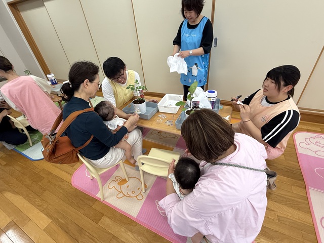 指に🐤を付けてわらべ歌を歌って、親子で楽しんでもらいました。子どもたちはピヨピヨさんに大喜び!