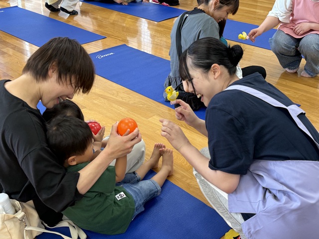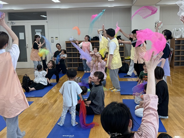 リズム遊びでは、卵の形のマラカスや、カラフルなスカーフを使って、音楽に合わせて楽しく体を動かしました。