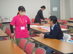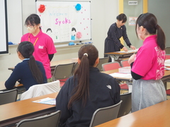 学科説明の後、模擬授業は「結ぶ・包む・贈る体験!はじめての冠婚葬祭マナーと祝儀袋づくり」