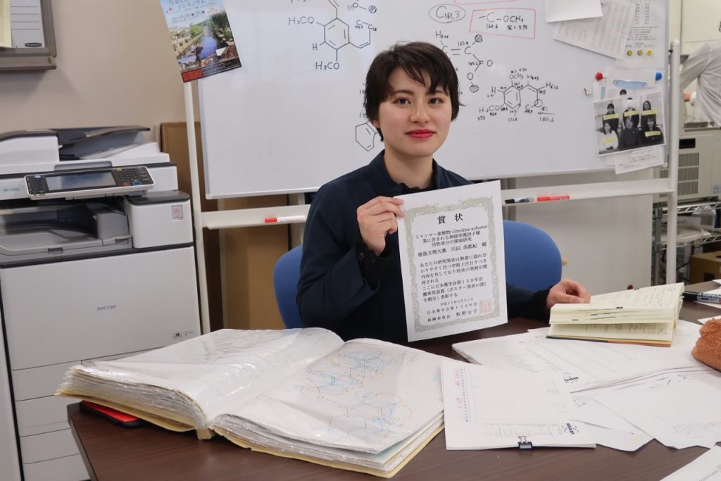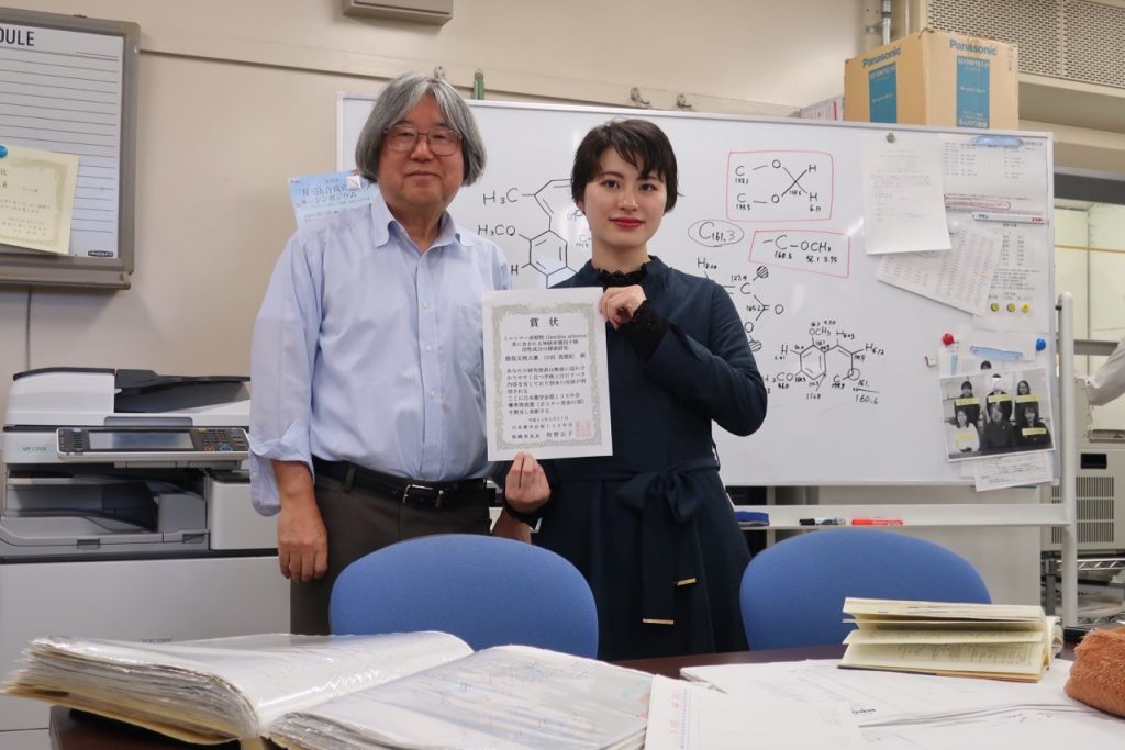 公開日 2019年05月11日 3月に開催された日本薬学会第139年会(千葉)において、本学部の学生2名が学生優秀発表賞を受賞しました。 受賞おめでとうございます。 今後のさらなる活躍を期待しています。 受賞者:井上 みなみさん(薬品製造学教室6年) 演題:「カメムシ分泌物への接触による皮膚の変色および蛍光発色の機序研究」 受賞者:川田 美都紀さん(薬品物理化学教室6年) 演題:「ミャンマー産植物Gmelina arborea茎に含まれる神経栄養因子様活性成分の探索研究」 川田美都紀さん 指導教員の福山教授と一緒に