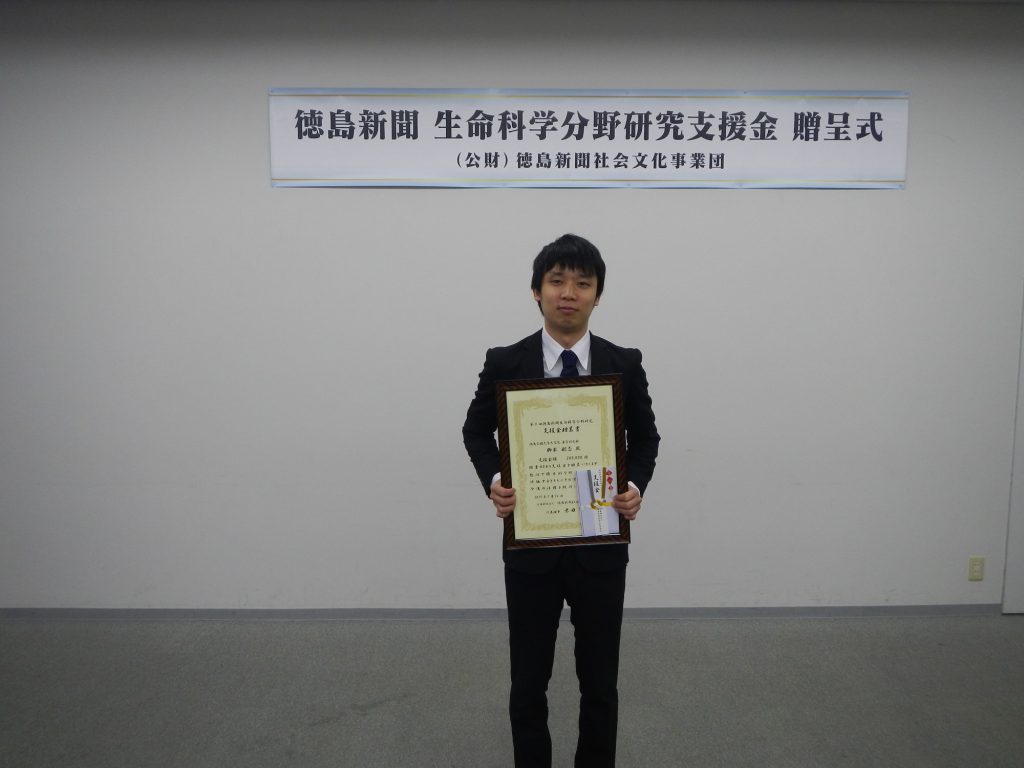 公開日 2019年07月25日 薬品製造学教室博士課程3年生の栁本剛志さんが「第8回徳島新聞生命科学分野研究支援金」に採択されました。 本支援金制度は、公益財団法人徳島新聞社社会文化事業団が徳島県における学生の健全で意欲的な生命科学分野研究活動の支援を行い、地域の学術研究向上に貢献することを目的として行っている事業です。 7/24(水)に徳島新聞社にて贈呈式が行われました。 栁本剛志さんの今後の更なる活躍を期待しています。