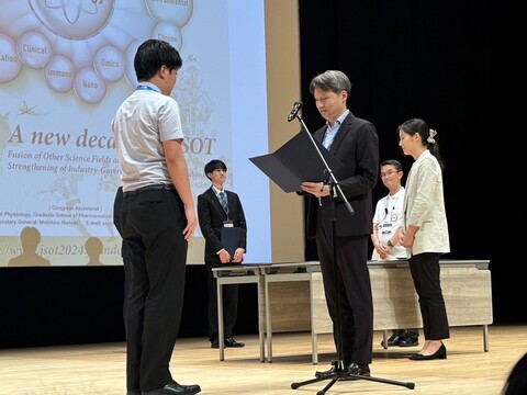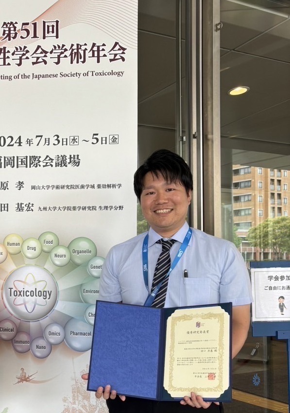 公開日 2024年07月16日 2024年7月5日、福岡国際会議場で開催された第51回日本毒性学会学術年会にて、本学大学院生の田口央基さん(薬物治療学研究室)が優秀研究発表賞を受賞しました。 優秀研究発表賞は、35歳以下が対象で、応募者はポスター発表に加え、口頭発表と質疑応答により選ばれます。 受賞演題:シスプラチン耐性近位尿細管細胞を用いた新規シスプラチン腎障害責任因子の探索 おめでとうごうざいます。益々の活躍を期待しています。