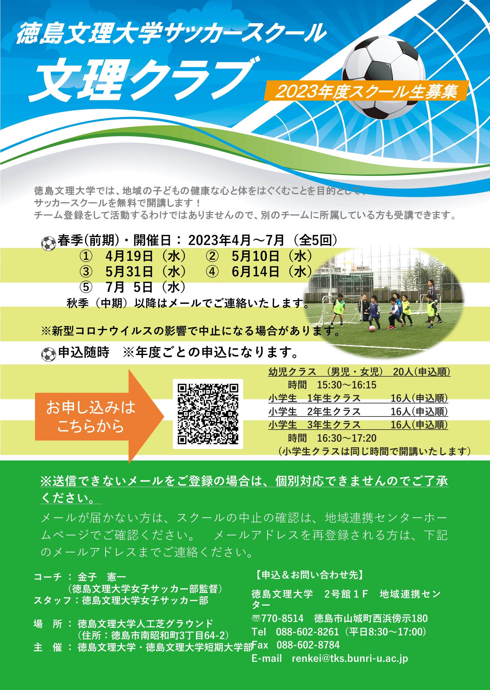 下記チラシのQRコードまたは下記のリンクから、①2023年度 徳島文理大学サッカースクール(文理クラブ)入会案内をよくお読みになり申込フォームよりお申し込みください。