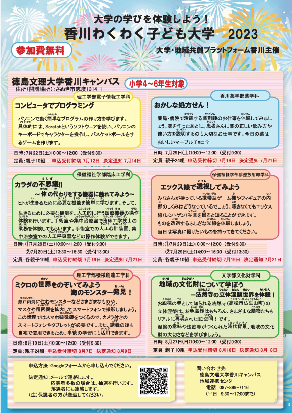 公開日 2023年07月07日 これまでの「徳島文理こども大学」を、今年度は大学・地域共創プラットフォーム香川主催「香川わくわく子ども大学」として開催します。 香川県内小学4~6年生を対象に、本学の学部・学科の特色を生かした6つの講座を開講します。 チラシのQRコードからお申し込みください。みなさまの参加をお待ちしています。