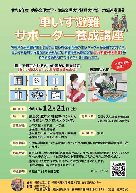 本講座では、災害時などに避難経路上に障がい物があるとき、車いすを使用する 要配慮者等を避難場所へ安全に移動支援(水平避難・垂直避難)ができる技術を身につけることを目指します。