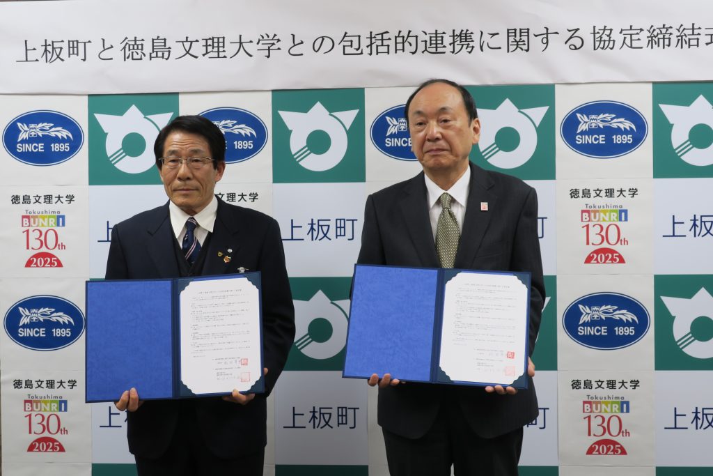 令和4年3月24日(水)、徳島文理大学・徳島文理大学短期大学は、上板町と包括的連携に関する協定を締結しました。協定式では、田村学長と松田卓男上板町長との間で調印が行われ、田村学長は「上板町の様々な産業や歴史文化などにふれる機会が多くなり、知の創造をはじめ地域の活性化や課題解決に向けた取り組みが一層活発となり、地域づくりのできる人材育成に向けまして一歩ずつ歩を進めて参りたい」と挨拶されました。