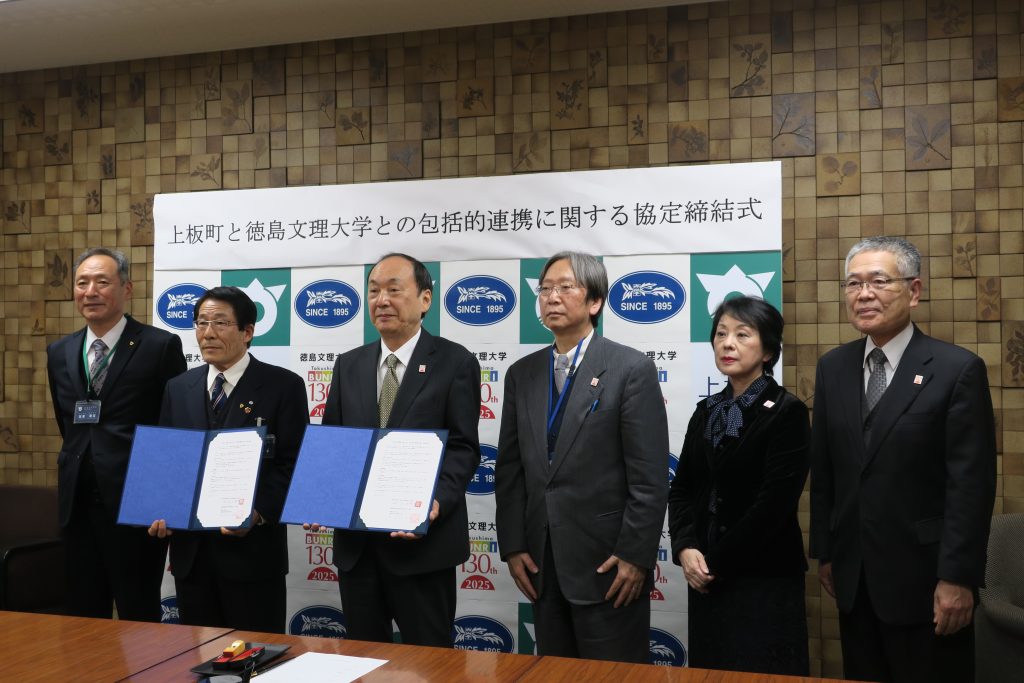 関係者の集合写真(左から、坂東上板副町長、松田 卓夫上板町長、田村学長、青野総合政策学部長、岡部短期大学部長、新見地域連携センター長)