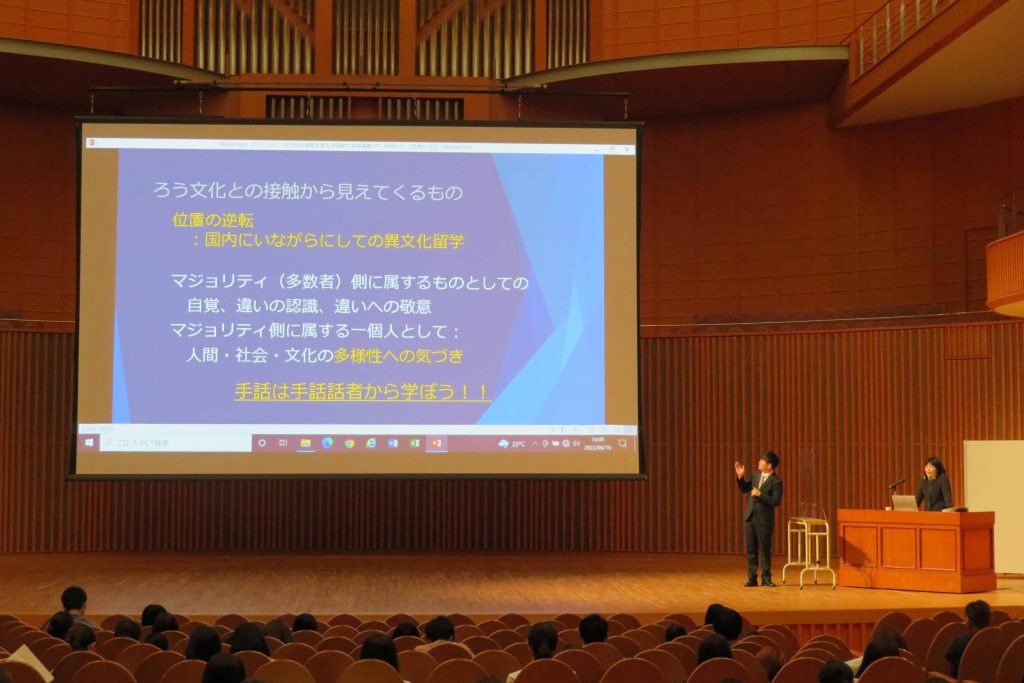 手話を学び、ろう者のコミュニティに入ることで、国内にいながら「異文化」に触れてきた飯泉氏。ろう文化への理解だけではなく、聴者のコミュニティに戻ってくることで感じたもの、見えてきたものがあると語ってくれました。自分とは異なる様式や常識に触れることで、人間・社会・文化の多様性に気づくきっかけとなり、違いを自覚・認識し、違いへの敬意を持つことが大切であるとお話頂きました。