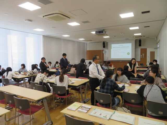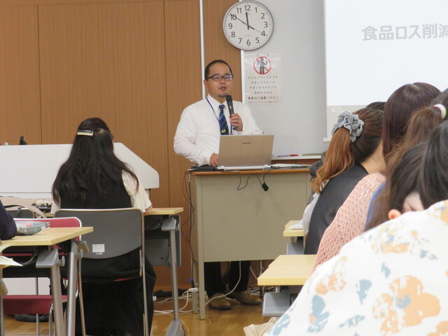 食品ロス削減推進サポーターの松井美穂様の講義では、食品ロスの現状説明の後に、どうすれば家庭から食品ロス量を減らせるかについてグループワークを行い活発な意見が交わされました。学生からは、「生ゴミを有料にしてはどうか」「SNS等で積極的に食品ロスを呼びかける」「自分の食べられる量をしっかり把握し必要のないものは買わない」「消費期限の近い物から冷蔵庫の前側に置く」などの意見が出されました。